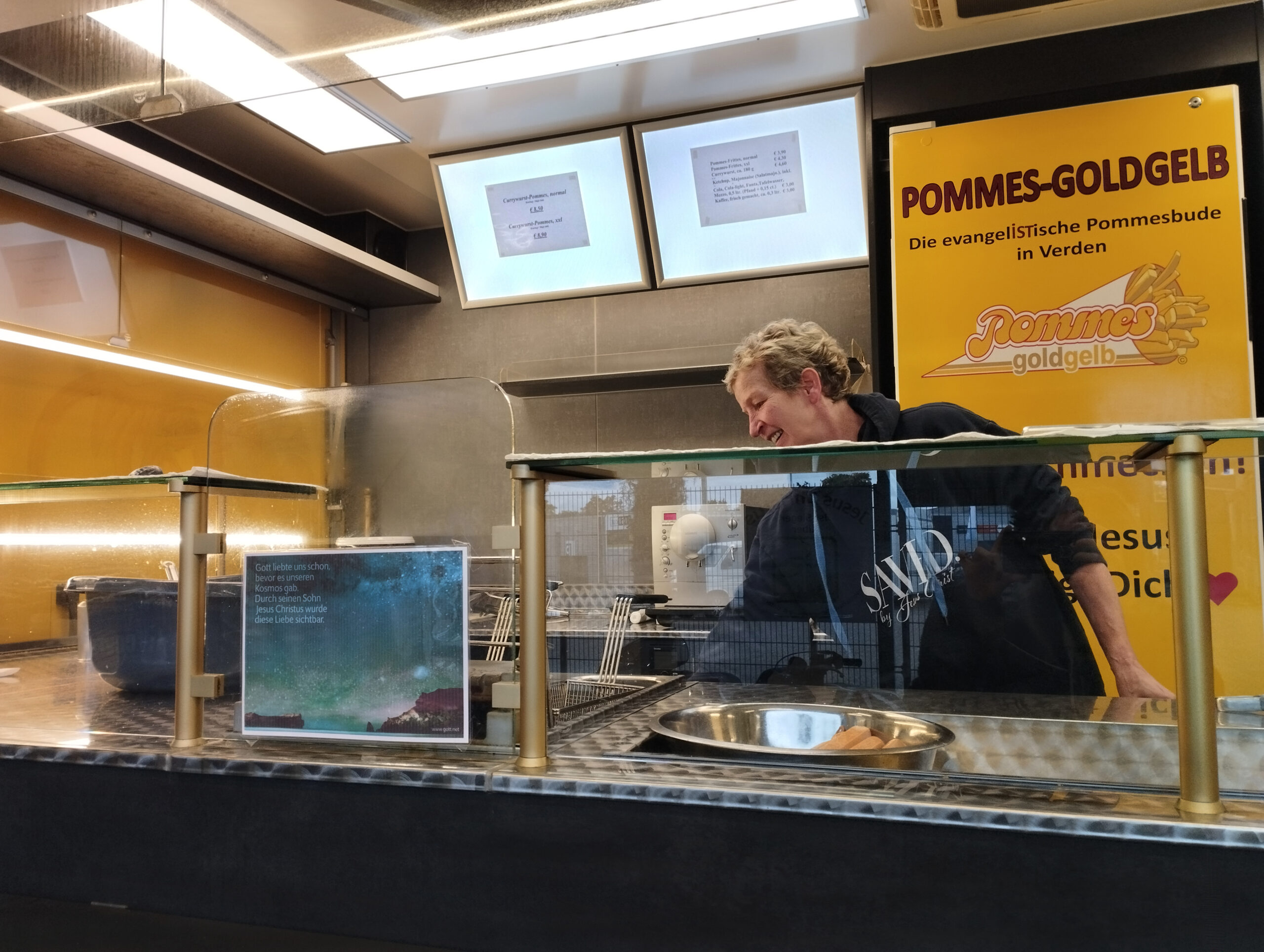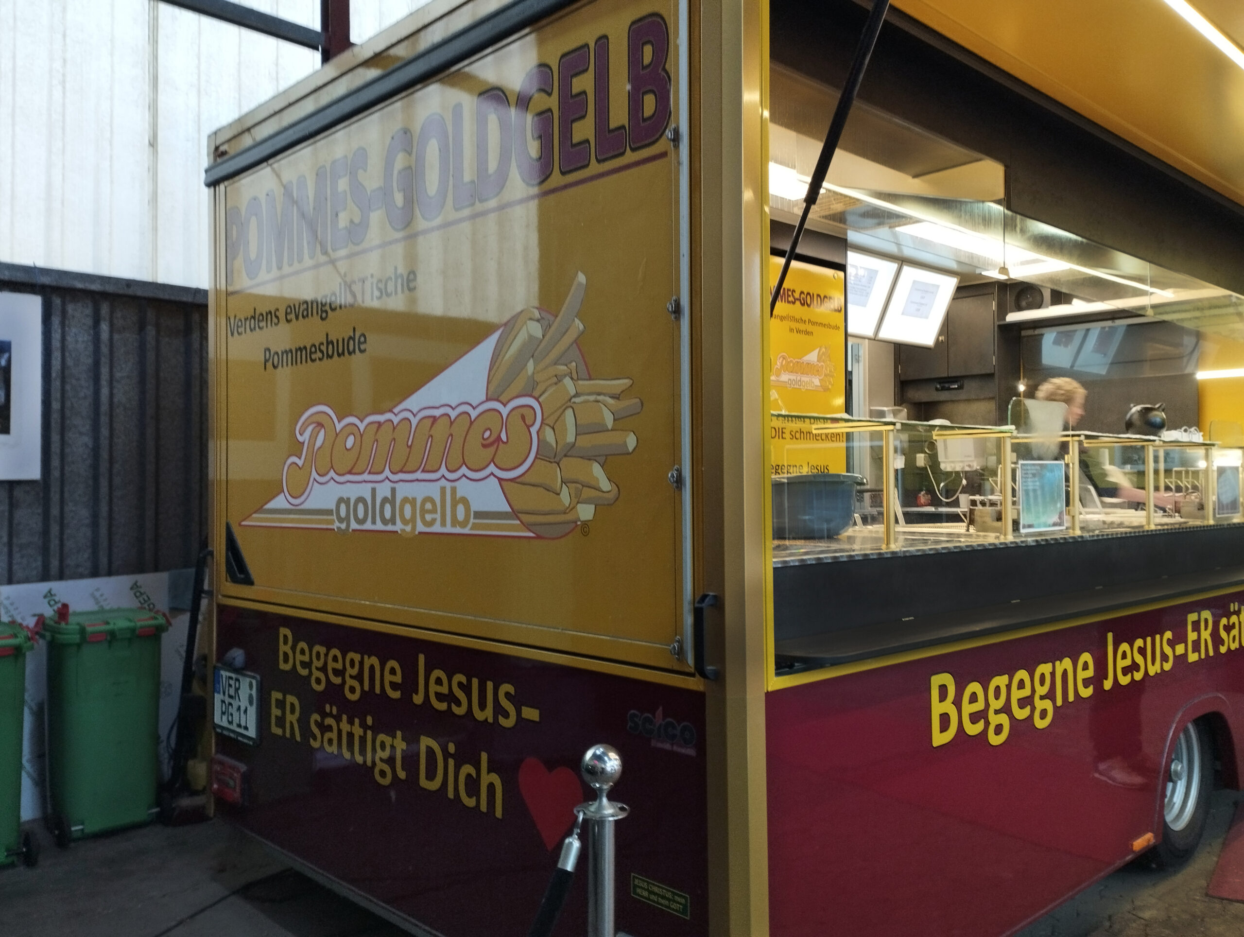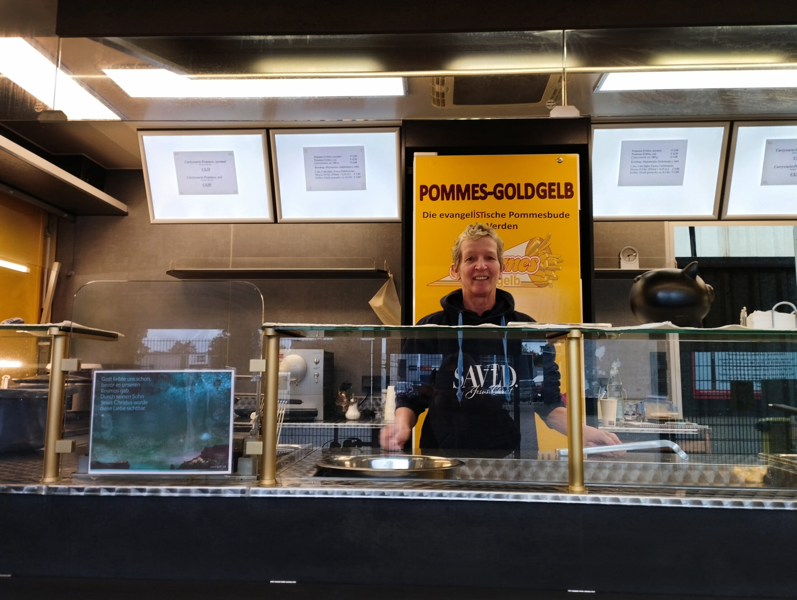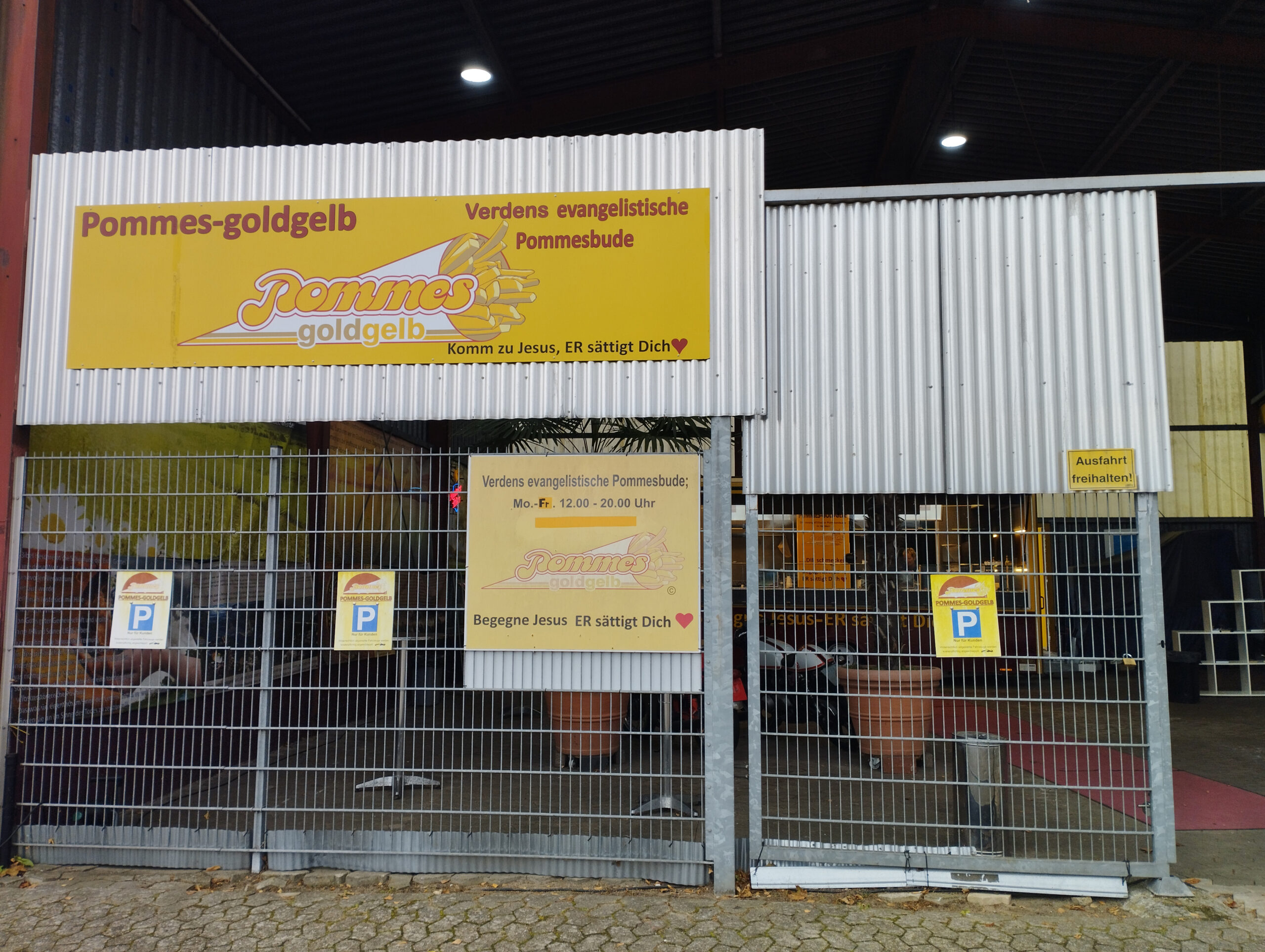Seit 2004 sind wir mit „ Pommes-goldgelb -Verdens evangelistische Pommesbude“ an diesem Standort ansässig. Viele Kunden kennen uns seit vielen Jahren und wir sind dankbar für die Treue. Wir sind keine große Kette, sondern dein ehrlicher Imbiss um die Ecke – mit Herzblut geführt und gerne für dich da. Eine gleichbleibend hohe Qualität ist uns sehr wichtig. Du fragst dich sicher: „Warum seid ihr eine evangelistische Pommesbude“ ? Die Antwort: wir glauben an das Evangelium, die frohe Botschaft von JESUS CHRISTUS und wir glauben, dass sich damit der Sinn des Lebens erfüllt. GOTT hat es uns ins Herz gelegt, Menschen in dieser teilweise herausfordernden Zeit eine Perspektive aufzuzeigen und ihnen Mut und Hoffnung zuzusprechen. Das geschieht in unserer zwanglosen Atmosphäre und selbstverständlich nur, wenn ihr es möchtet. Niemand wird von uns bedrängt! Unser GOTT hat hier einen Ort der Begegnungen geschaffen. Ob du an IHN glaubst oder nicht, ist egal - Du bist herzlich willkommen. Du kannst hier in Ruhe verweilen und deine Currywurst-Pommes genießen oder du lässt sie dir zum Mitnehmen einpacken. Wir haben ein offenes Ohr für dich und wenn du ein Gebet brauchst, sind wir auch an deiner Seite. Wir wünschen dir eine gesegnete Mahlzeit und reichen Segen!