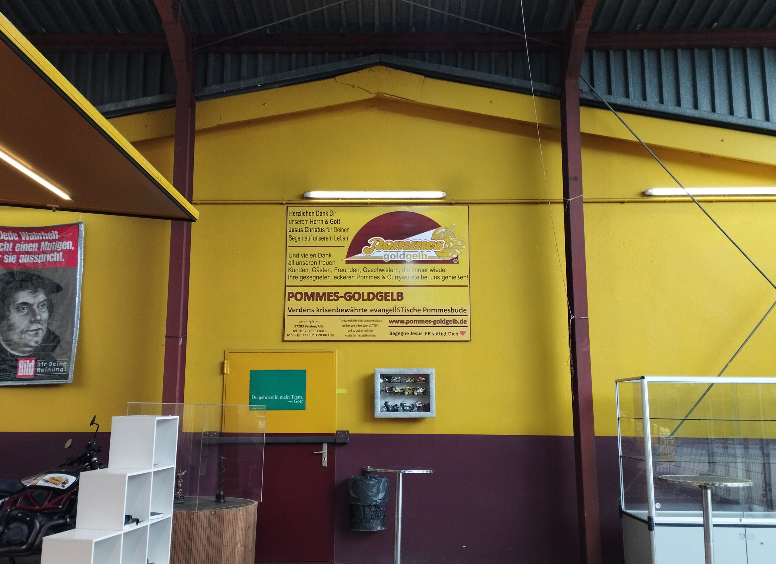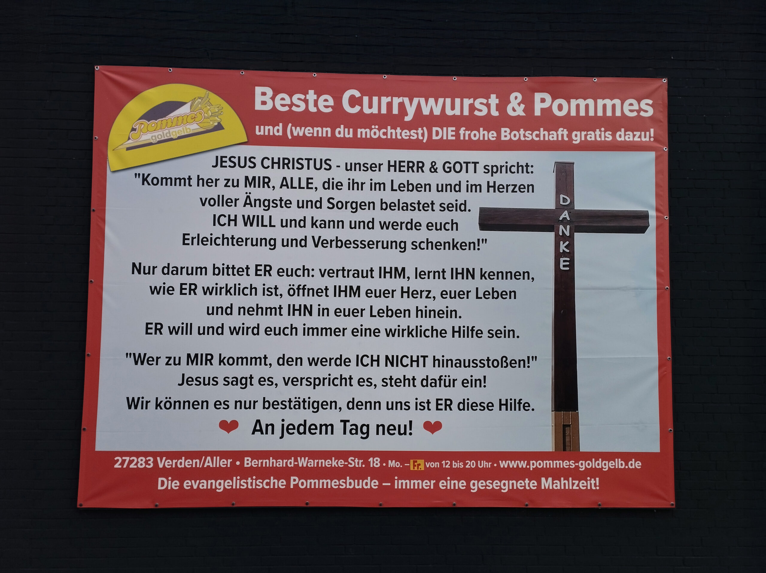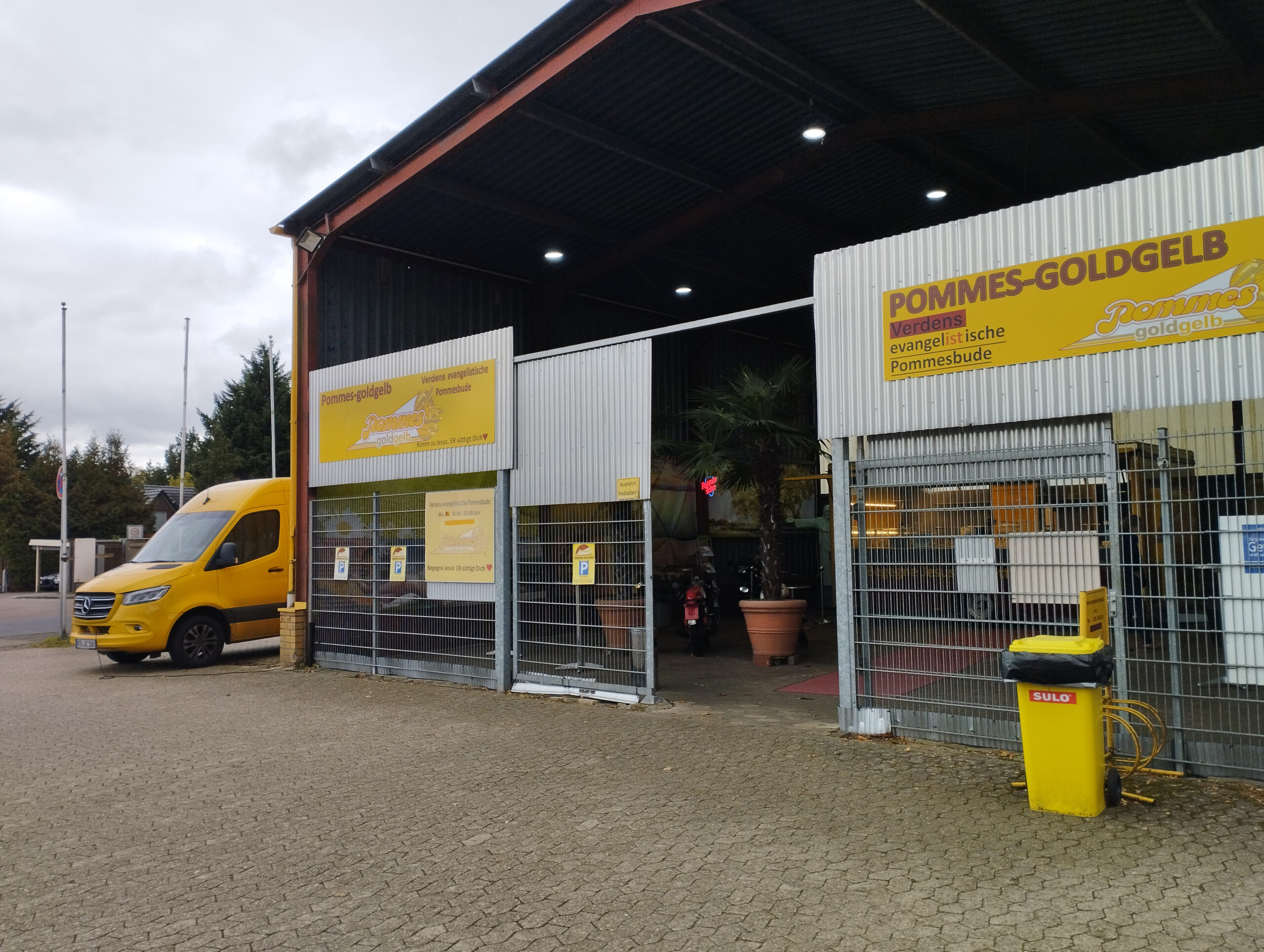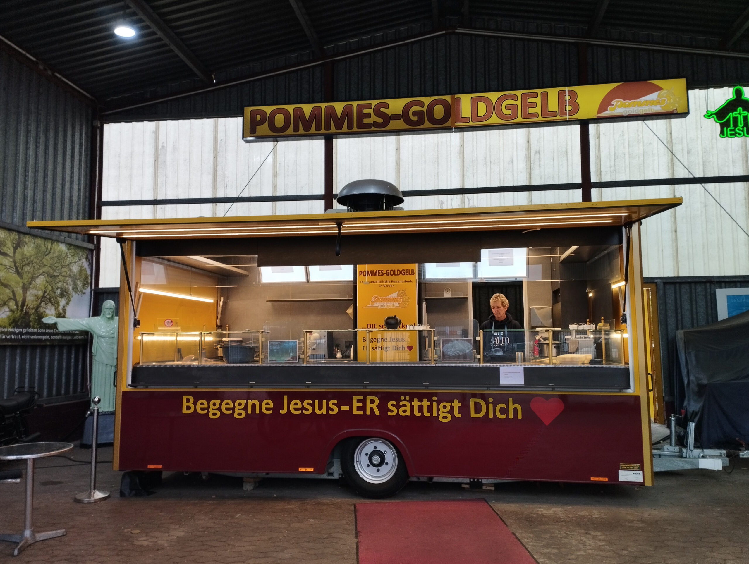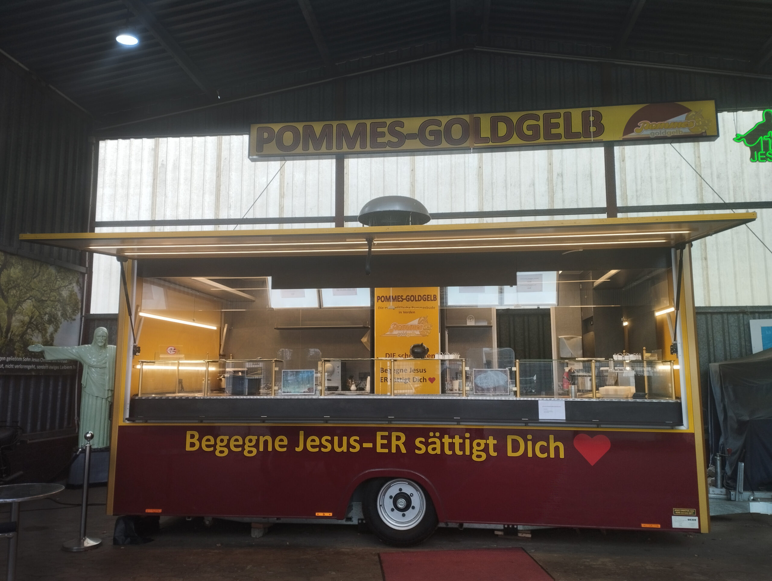 Seit 2004 sind wir mit „ Pommes-goldgelb -Verdens evangelistische Pommesbude“ an diesem Standort ansässig. Viele Kunden kennen uns seit vielen Jahren und wir sind dankbar für die Treue. Wir sind keine große Kette, sondern dein ehrlicher Imbiss um die Ecke – mit Herzblut geführt und gerne für dich da. Eine gleichbleibend hohe Qualität ist uns sehr wichtig. Du fragst dich sicher: „Warum seid ihr eine evangelistische Pommesbude“ ? Die Antwort: wir glauben an das Evangelium, die frohe Botschaft von JESUS CHRISTUS und wir glauben, dass sich damit der Sinn des Lebens erfüllt. GOTT hat es uns ins Herz gelegt, Menschen in dieser teilweise herausfordernden Zeit eine Perspektive aufzuzeigen und ihnen Mut und Hoffnung zuzusprechen. Das geschieht in unserer zwanglosen Atmosphäre und selbstverständlich nur, wenn ihr es möchtet. Niemand wird von uns bedrängt! Unser GOTT hat hier einen Ort der Begegnungen geschaffen. Ob du an IHN glaubst oder nicht, ist egal - Du bist herzlich willkommen. Du kannst hier in Ruhe verweilen und deine Currywurst-Pommes genießen oder du lässt sie dir zum Mitnehmen einpacken. Wir haben ein offenes Ohr für dich und wenn du ein Gebet brauchst, sind wir auch an deiner Seite. Wir wünschen dir eine gesegnete Mahlzeit und reichen Segen!